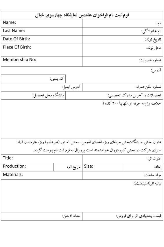 _متقاضیان باید ضمن تکمیل فرم شرکت در نمایشگاه و ارسال تصاویر سه اثر از آثار متأخر خود (ترجیحاً از یک مجموعه) به دبیرخانه انجمن ارسال نمایند.