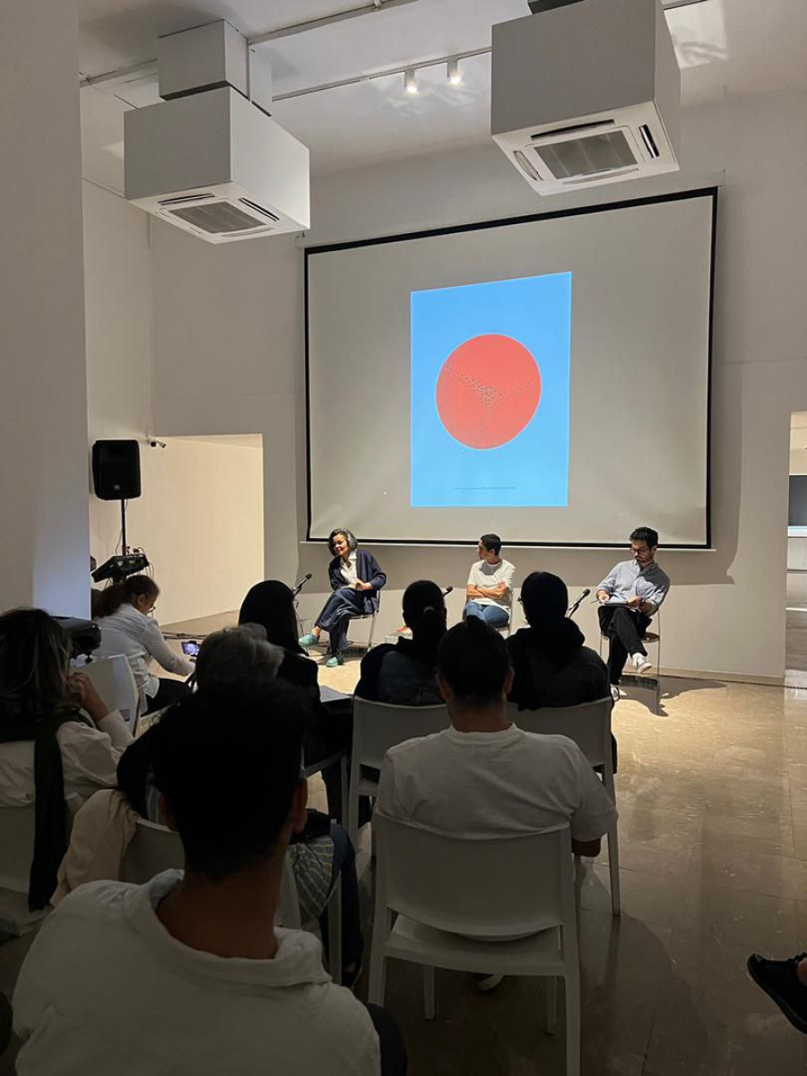 نخستین برنامه گفت و گوی هنرمند با حضور مهسا کریمی زاده؛ هنرمند عرصه هنر مجسمه سازی و مفهومی، حمیدرضا کرمی و سحرعلایی به عنوان پنلیست و تحلیل گردرحوزه های پدیدارشناختی و روانکاوی و علاقه مندان وهنرمندان، به همت انجمن مجسمه سازان و بنیاد لاجوردی، روز جمعه سیزدهم مهرماه در محل گالری بنیاد لاجوردی برگزار شد. در آغاز این مراسم، کوروش گلناری ریاست هیات مدیره انجمن مجسمه سازان، ضمن خوشامدگویی به مخاطبین جلسه، از تلاش انجمن در جهت ادامه دار شدن چنین نشست هایی خبر داده و از مدیریت بنیاد لاجوردی برای همراهی در برگزاری این رخداد تشکر کرد. سپس مهسا کریمی زاده درباره آثار خود که اردیبهشت ماه سال جاری در نمایشگاهی با عنوان «پیش بینی گریز» در گالری لاجوردی به نمایش درآمده بود توضیحاتی ارائه داد. او بیان کرد که نقطه آغاز اجرای آثارش از جایی بوده که پروژه پایان نامه کارشناسی مجسمه سازی خود را در دانشگاه تهران آغاز کرده و ذرات میکروسکوپی را محور ساخت اثر هنری قرار داده بود. پس از آفرینش این آثار کارهایی که ارائه شدند به سمت و سویی پیش رفتند که از نمایش کوچک ترین ها به نمایش لکه های خورشیدی، بی نهایت و سیاه چاله ها بی شباهت نبوده و به عبارتی جهان اکبر و جهان اصغر و رابطه بین این دو در این آثار مطرح شده اند. مهسا به چیدمان های خود اشاره نمود که با الهام گرفتن از فرم درخت به آن ها دست پیدا کرده و سال ها با استفاده از جوانه ها و شاخه های رستنی بر بدنه درخت به خلق آثار هنری پرداخته است.