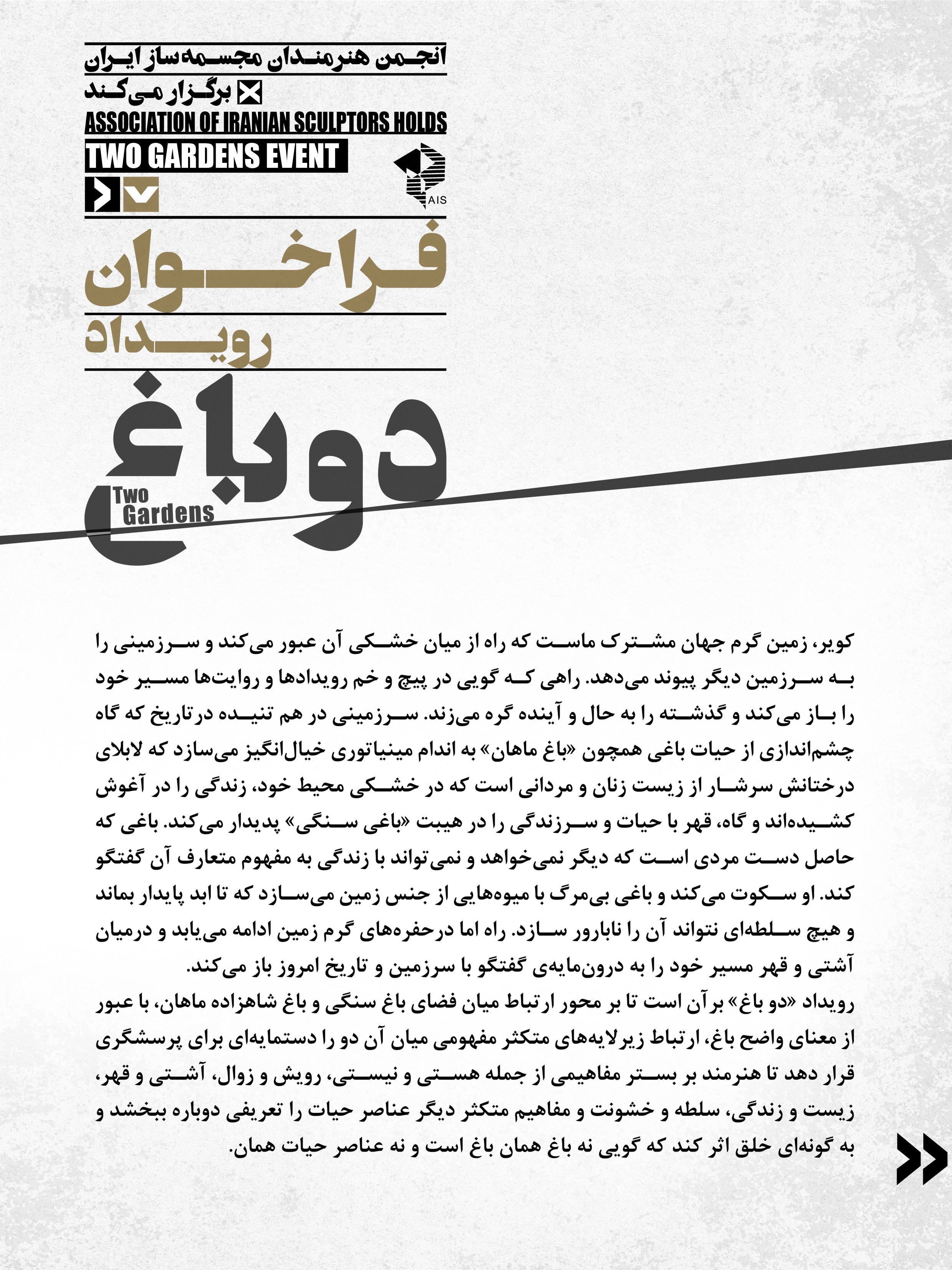 رویداد «دو باغ» برآن است تا بر محور ارتباط میان فضای باغ سنگی و باغ شاهزاده ماهان، با عبور از معنای واضح باغ، ارتباط زیرلایههای متکثر مفهومی میان آن دو را دستمایهای برای پرسشگری قرار دهد تا هنرمند بر بستر مفاهیمی از جمله هستی و نیستی، رویش و زوال، آشتی و قهر، زیست و زندگی، سلطه و خشونت و مفاهیم متکثر دیگر عناصر حیات را تعریفی دوباره ببخشد و به گونهای خلق اثر کند كه گويي نه باغ همان باغ است و نه عناصر حیات همان.