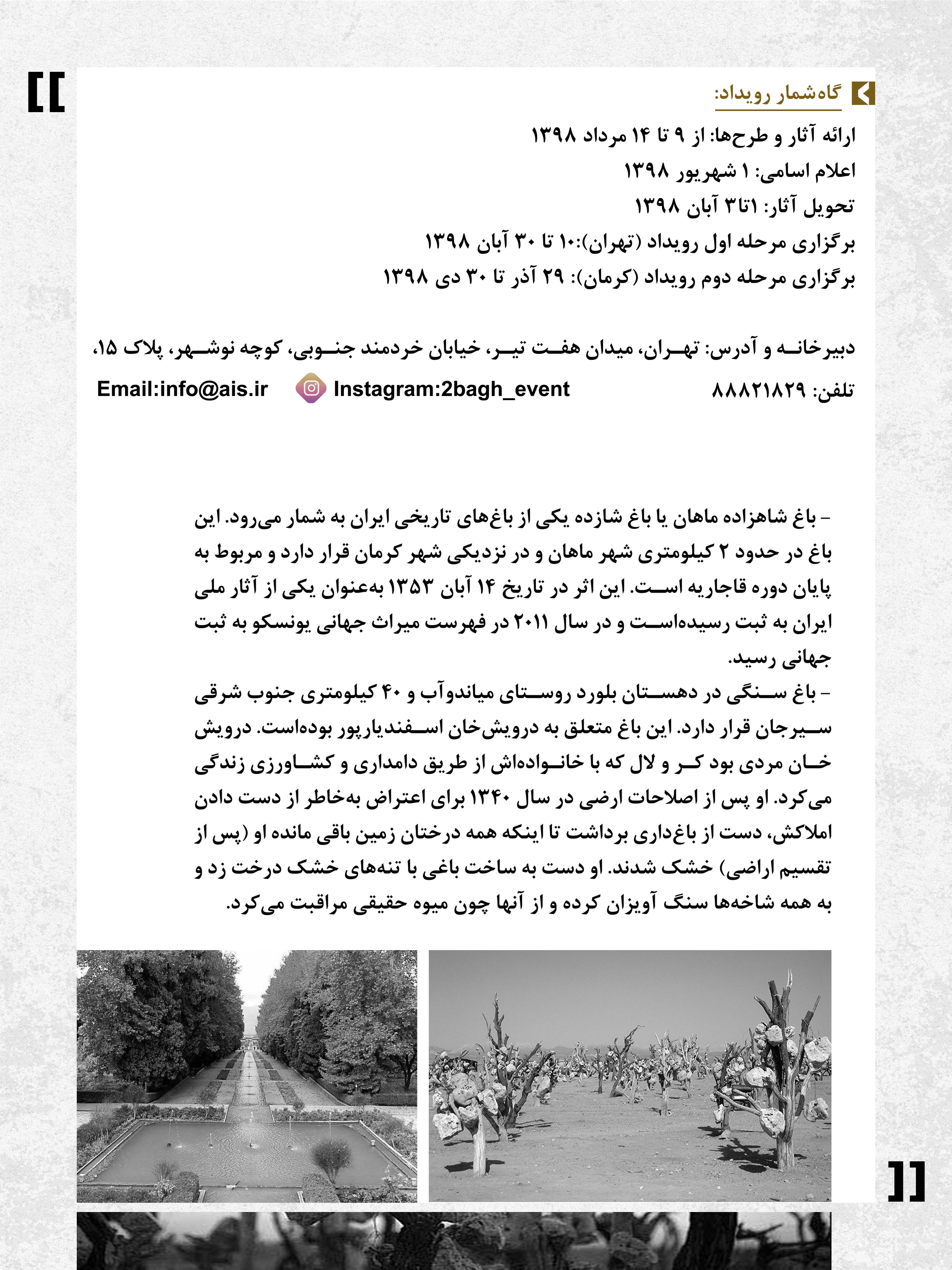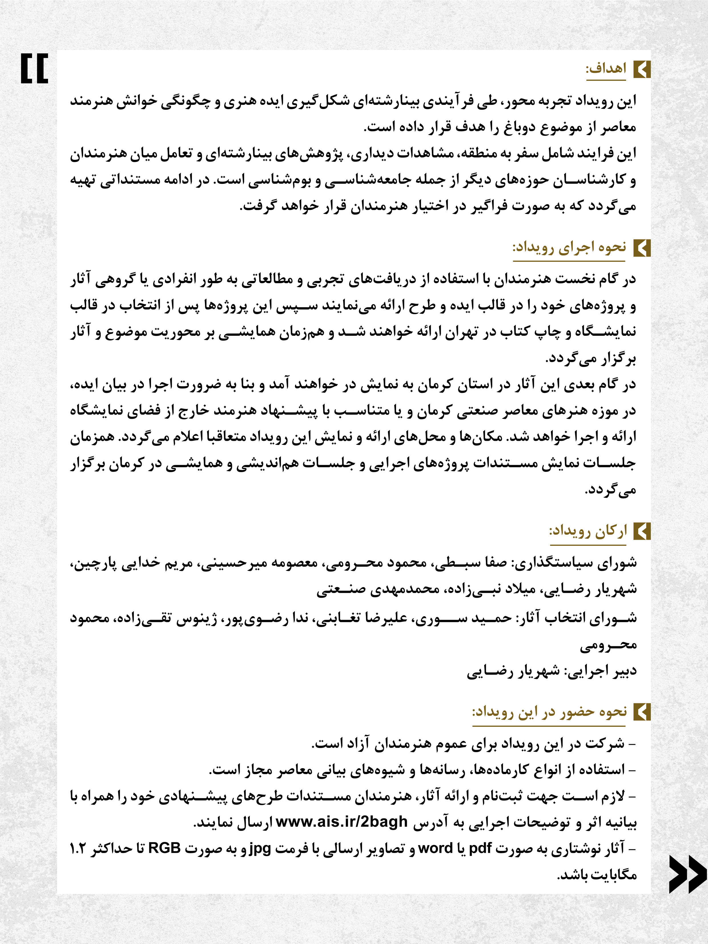 - لازم است جهت ثبتنام و ارائه آثار، هنرمندان مستندات طرحهای پیشنهادی خود را همراه با بیانیه اثر و توضیحات اجرایی به آدرس www.ais.ir/2bagh ارسال نمایند.