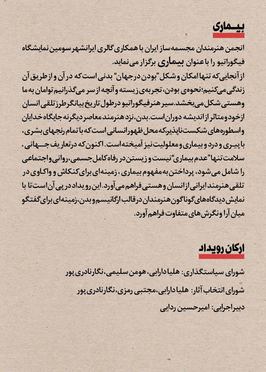 انجمن هنرمندان مجسمه ساز ایران با همکاری گالری ایرانشهر سومین نمایشگاه فیگوراتیو را با عنوان بیماری برگزار می نمايد.
