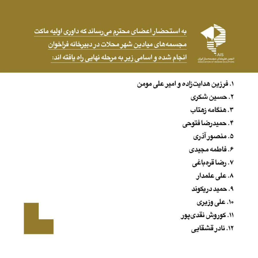 ه استحضار اعضای محترم می رساند که داوری اولیه ماکت مجسمه های میادین شهر محلات در دبیرخانه فراخوان انجام شده و اسامی زیر به مرحله نهایی راه یافته اند: